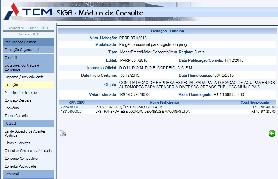 A prefeitura de Prado, homologou no último dia 30 de dezembro de 2015, através de licitação número PPRP 051/2015, para CONTRATAÇÃO DE EMPRESA ESPECIALIZADA PARA LOCAÇÃO DE AQUIPAMENTOS AUTOMORES PARA ATENDER A DIVERSOS ÓRGÃOS PÚBLICOS MUNICIPAIS, o valor de R$ 16.388.880,00 ( dezesseis milhões trezentos e oitenta e oito mil e oitocentos e oitenta reais.