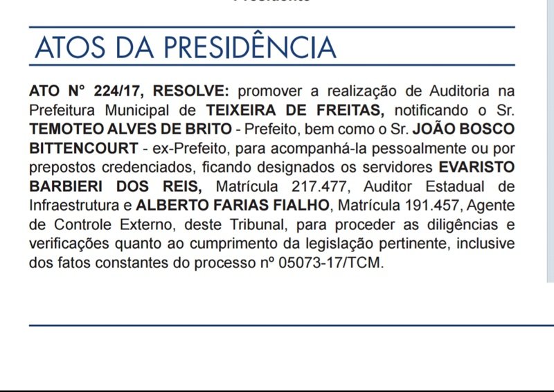 Foi publicado no Diário Oficial do Tribunal de Contas dos Municípios na terça feira, (11), o Ato da Presidência 224/17, para promover realização de auditoria no município de Teixeira de Freitas.