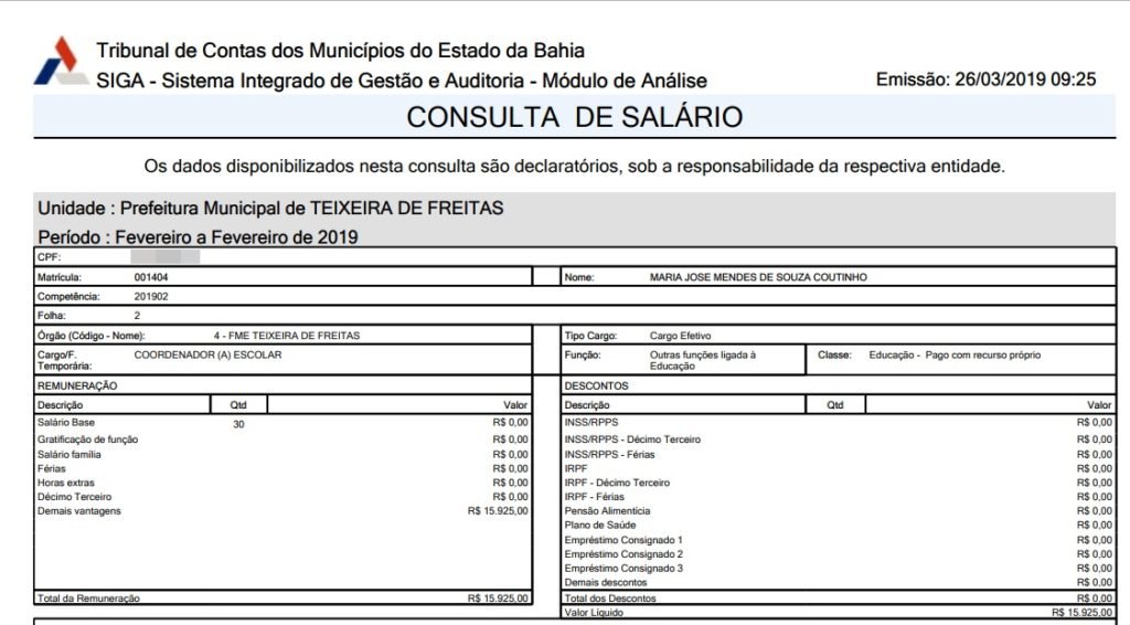 Nossa equipe de reportagem, consultando o site do TCM (Tribunal de Contas dos Municípios), encontrou uma situação incomum, referente ao salário de uma Coordenadora Escolar, lotada na Secretaria de Educação de Teixeira de Freitas.