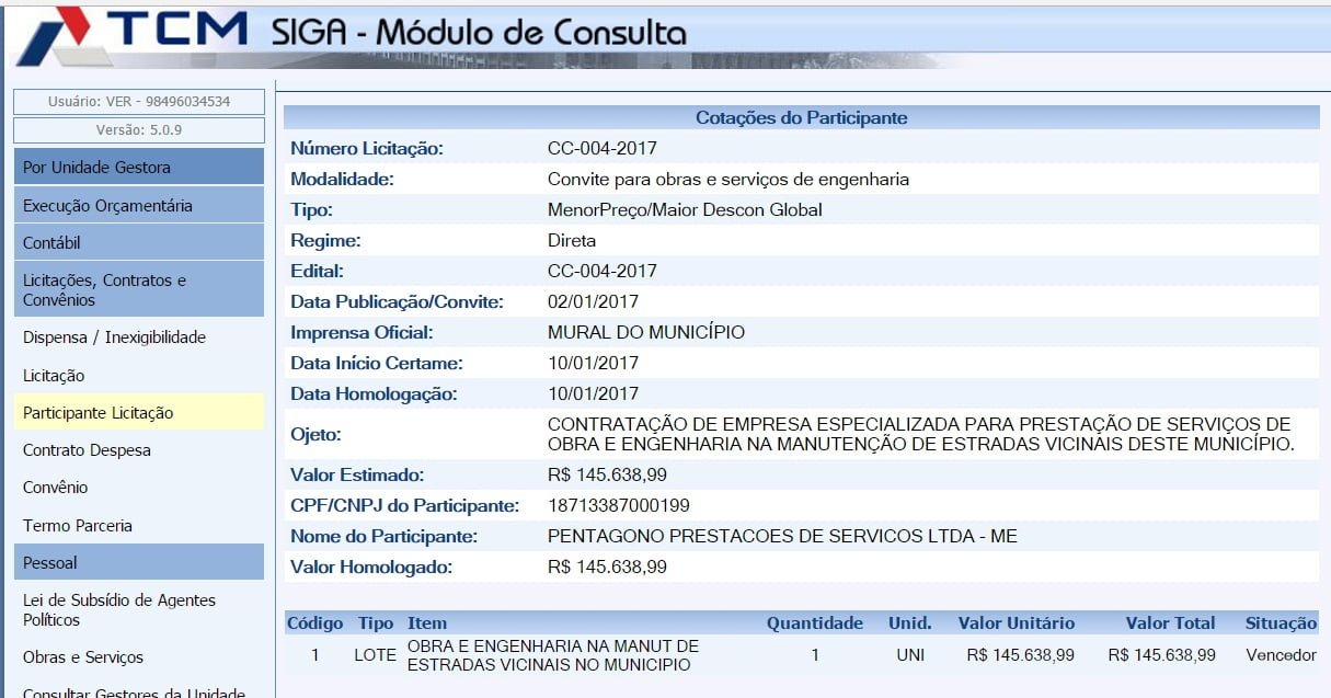 A empresa vencedora do processo licitatório foi PENTÁGONO PRESTAÇÕES DE SERVIÇOS LTDA – ME, CNPJ 18.713.387/0001-99, com endereço à Avenida Florlirio, 146, bairro São Judas Tadeu em Caravelas.