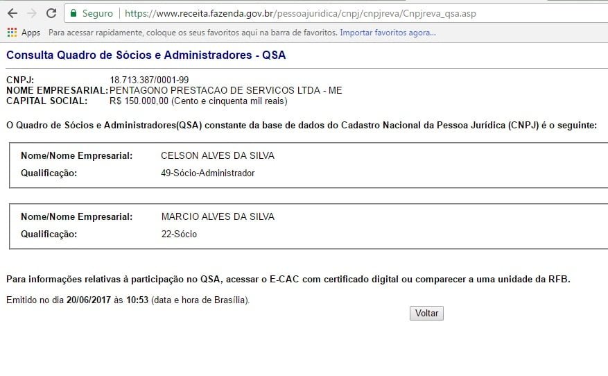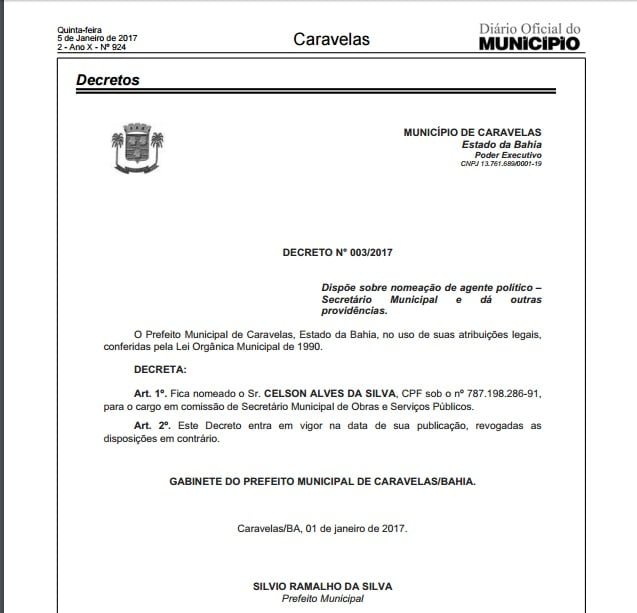 Em uma consulta no site da Receita Federal, restou comprovado que a empresa aberta em 28 de maio de 2013, tem como sócio administrador Celso Alves da Silva, atual secretário de obras da cidade de Caravelas.