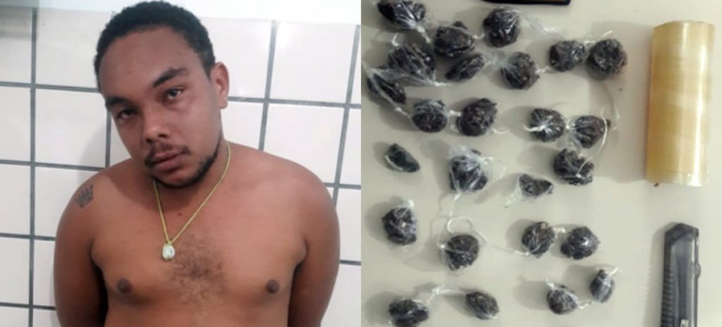Ao chegar no endereço a guarnição encontrou Eduardo Cruz de Souza e, durante buscas na sua residência, foram encontrados um recipiente contendo 25 buchas de maconha, pesando aproximadamente 34 gramas, material para embalar drogas e a quantia de R$ 4,25 em espécie.