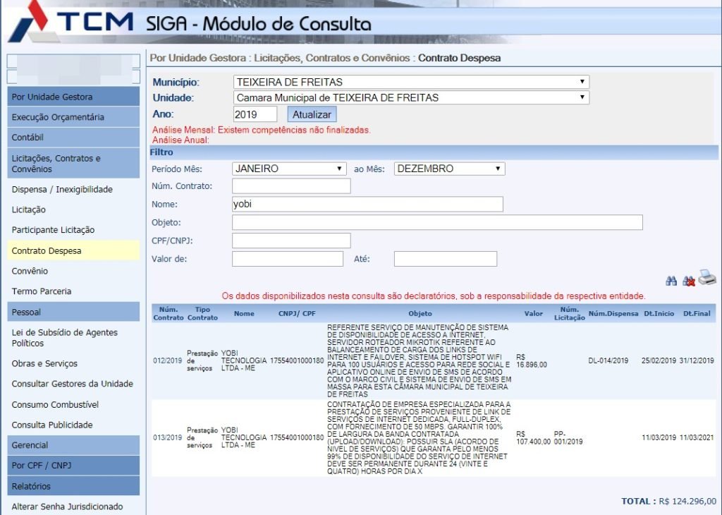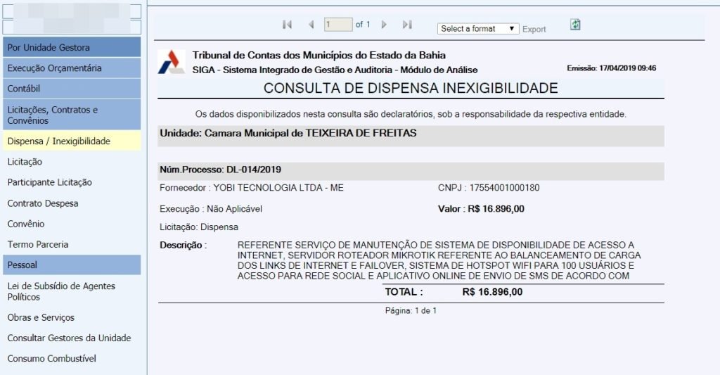 A Câmara Municipal de Teixeira de Freitas, através do seu presidente Ronaldo Cordeiro, o Ronaldo Baitakão, homologou no último dia 11 de março de 2019, a Licitação número PP 001/2019 para CONTRATAÇÃO DE EMPRESA ESPECIALIZADA PARA A PRESTAÇÃO DE SERVIÇOS PROVENIENTE DE LINK DE SERVIÇOS DE INTERNET, no valor de R$ 107.400,00 (cento e sete mil e quatrocentos reais).