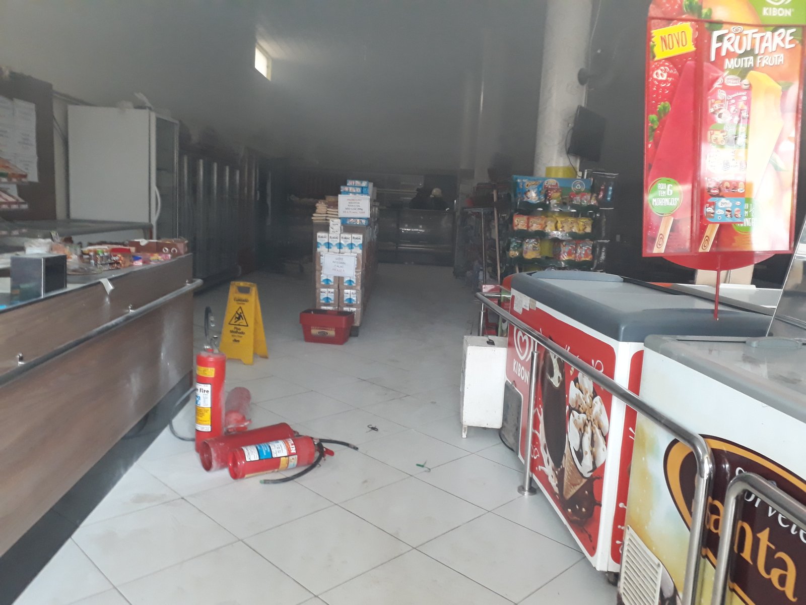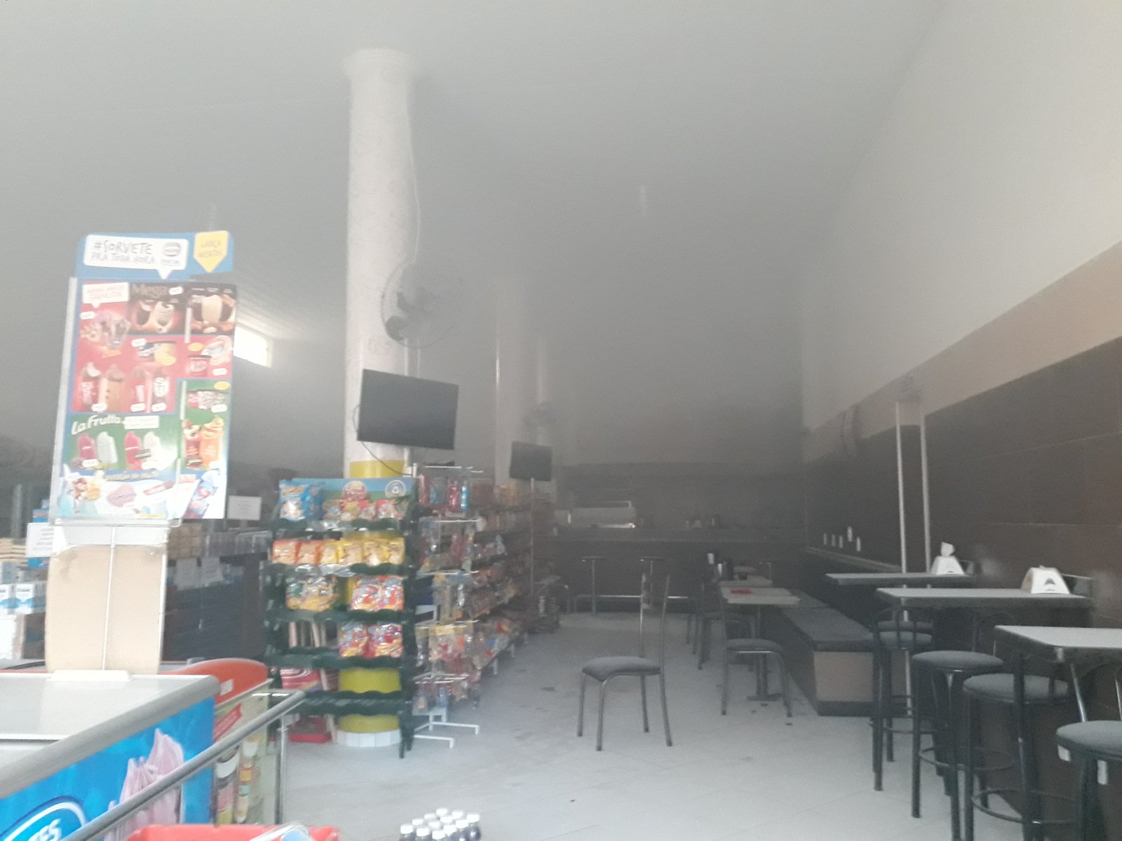 O estabelecimento ficou parcialmente destruído pelo fogo e muita fumaça acumulada no local.