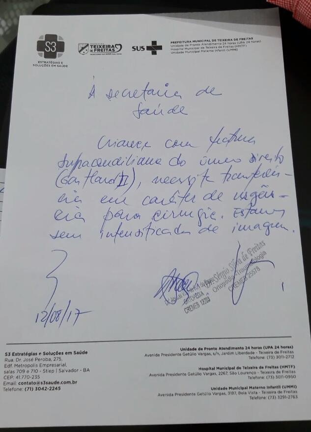 “Criança com fratura do úmero direito, necessita de transferência em caráter de urgência para cirurgia. Estamos sem intensificador de imagem”.