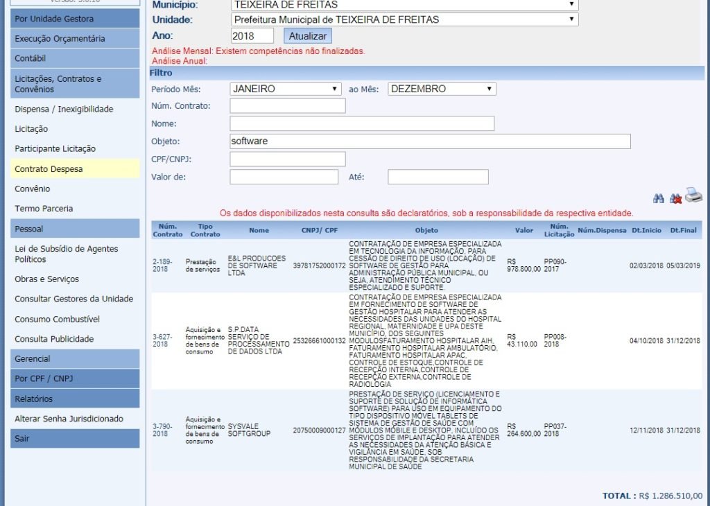 A prefeitura de Teixeira de Freitas homologou no ano de 2018, 03 licitações para aquisição de Software, no valor total de R$ 1.286.510,00 (um milhão duzentos e oitenta e seis mil e quinhentos e dez reais).