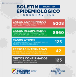 Nesta Segunda Feira (04 de Janeiro), a Secretaria de Saúde de Teixeira de Freitas informa que houve registro de 38 novos casos positivados. Até o momento são 9208. Destes, 125 considerados ativos.