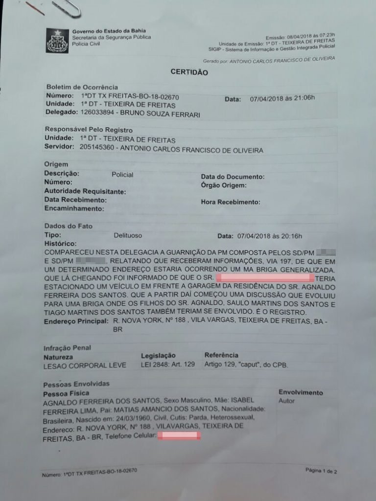 A Polícia Militar foi acionada através do telefone 190, e uma guarnição do PETO deslocou-se para o local e conduziu todos os envolvidos para a delegacia, onde foi registrada a ocorrência de lesão corporal leve, previsto na Lei 2848, artigo 129 do CPB, que rege: