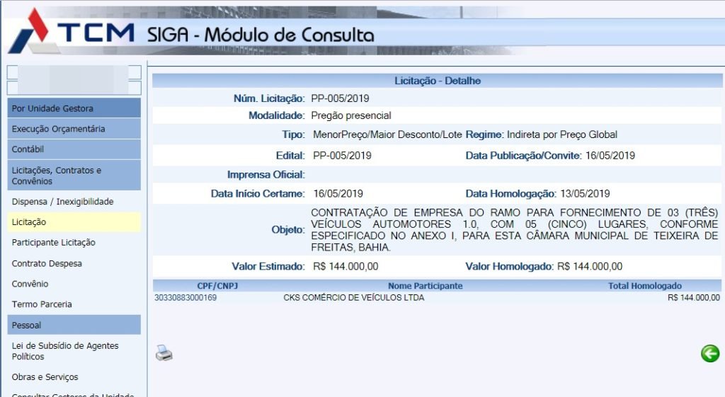 O Presidente da Câmara de Vereadores de Teixeira de Freitas, Ronaldo Alves Cordeiro, o “Ronaldo Baitakão”, homologou no último dia 13 de maio de 2019, a licitação número PP-005/2019, para CONTRATAÇÃO DE EMPRESA DO RAMO PARA FORNECIMENTO DE 03 (TRÊS) VEÍCULOS AUTOMOTORES 1.0, COM 05 (CINCO) LUGARES, CONFORME ESPECIFICADO NO ANEXO I, PARA ESTA CÂMARA MUNICIPAL DE TEIXEIRA DE FREITAS, no valor de R$ R$ 144.000,00 (cento e quarenta e quatro mil reais).