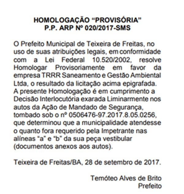 Após a liminar concedida pelo Juiz de Direito Dr. Roney Jorge Moreira Cunha, suspendendo a realização de uma nova licitação para o contratação de empresa especializada na prestação de serviços de coleta, transporte, tratamento e destinação final de resíduos do lixo hospitalar do município de Teixeira de Freitas, o prefeito Temóteo Alves de Brito, recuou de sua decisão e acabou por anular o seu ato ilegal reconhecendo assim a culpa pela sua má gestão.