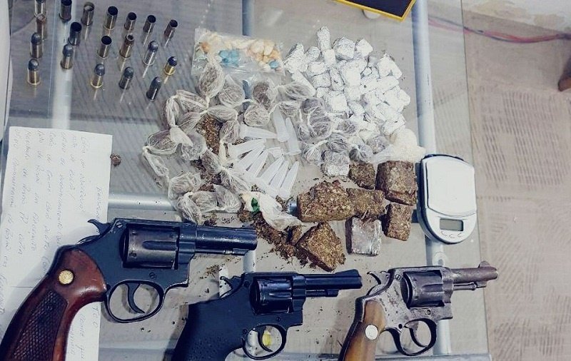 Com os criminosos a polícia apreendeu 68 buchas em um total de 105g e 6 tabletes menores no total de 58,5g de “maconha”; dois petecas totalizando 7,3g de “cocaína” e mais nove pinos vazios; 39 pedras de “crack”; dois revólveres cal. 38; 16 munições de calibre 38, sendo 11 intactas e cinco deflagradas; um revólver calibre 32 (seis munições, sendo três intactas e três deflagradas) e uma balança de precisão.