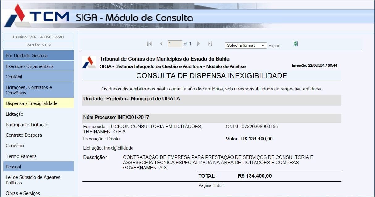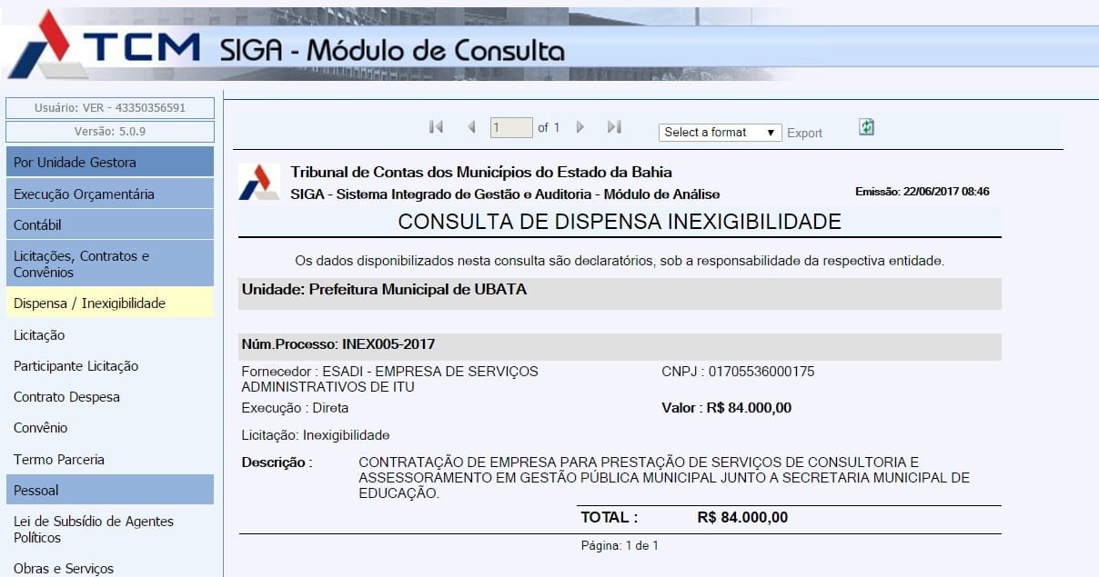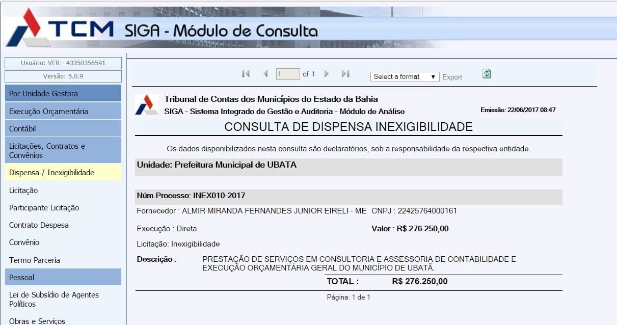 A cidade de Ubatã, que conta hoje com pouco mais de 20 mil habitantes segundo o IBGE 9 Instituto Brasileiro de Geografia e Estatísticas, contratou com Dispensa/Inexibilidade ( sem licitação), segundo o site do TCM, (Tribunal de Contas dos Municípios), três empresas, que juntas totalizaram quase meio milhão de reais, somente com serviços de consultoria.