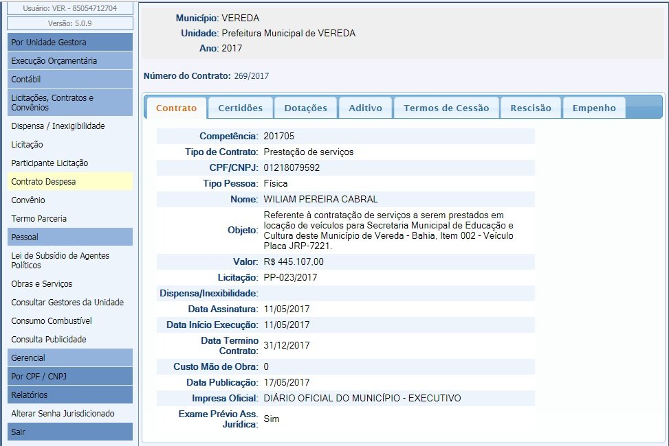 A prefeitura de Vereda homologou no último dia 17 maio, através de licitação PP-023/2017 para contratação de serviços a serem prestados em locação de veículos para Secretaria Municipal de Educação e Cultura deste Município de Vereda – Bahia, Item 002 – Veículo Placa JRP-7221 pelo valor de R$ 445.107,00 (quatrocentos e quarenta e cinco mil e dezessete centavos), na pessoa física de WILIAM PEREIRA CABRAL.