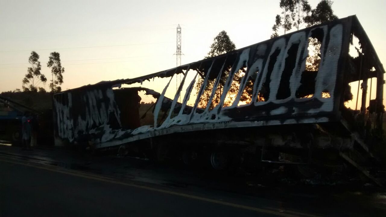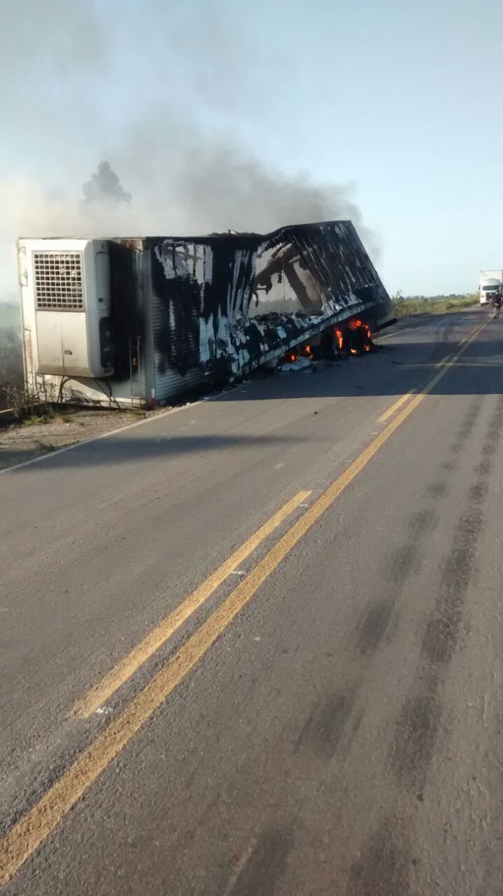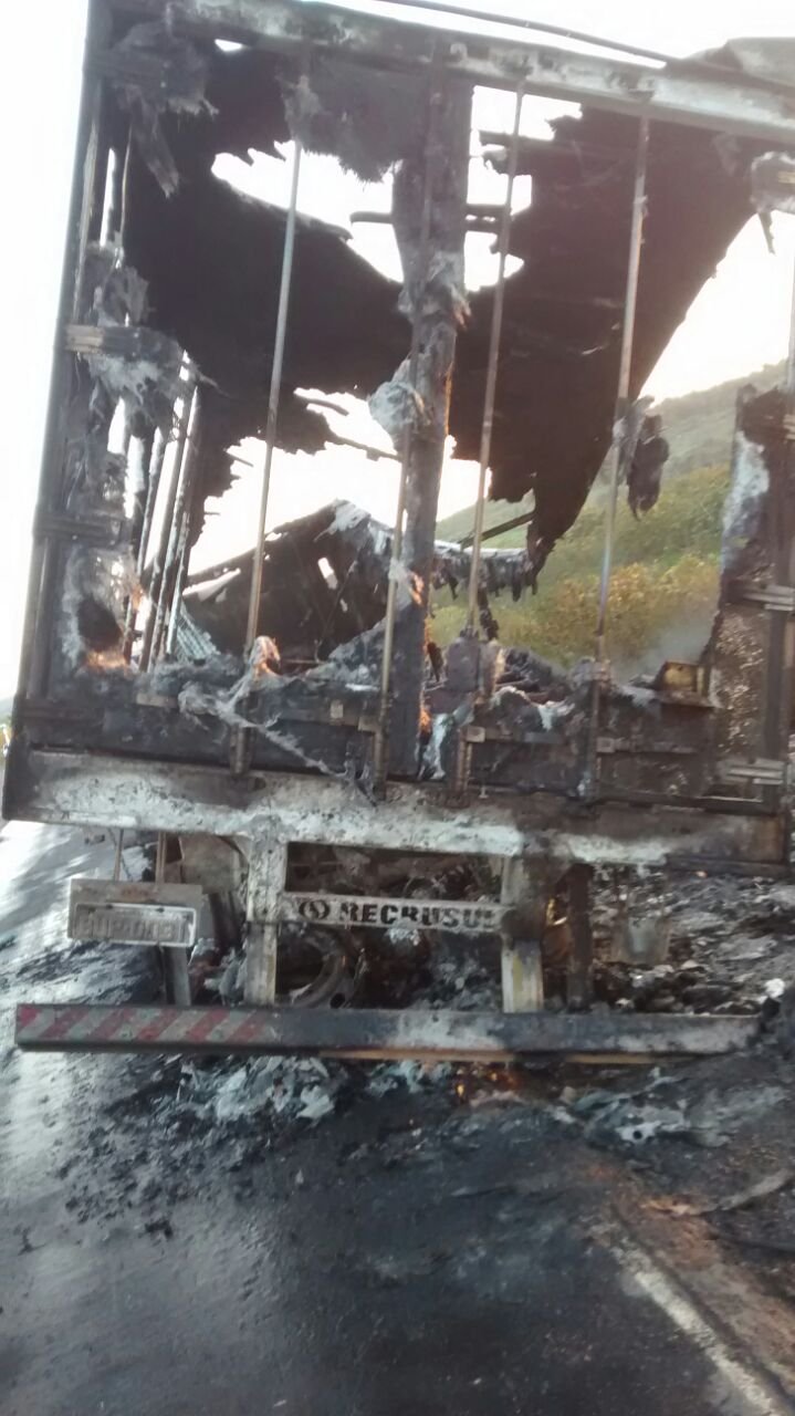 O incêndio ocorreu, devido ao tanque de combustível ter se soltado. O baú da carreta, ficou totalmente destruído. No momento do acidente, não havia carga no baú.