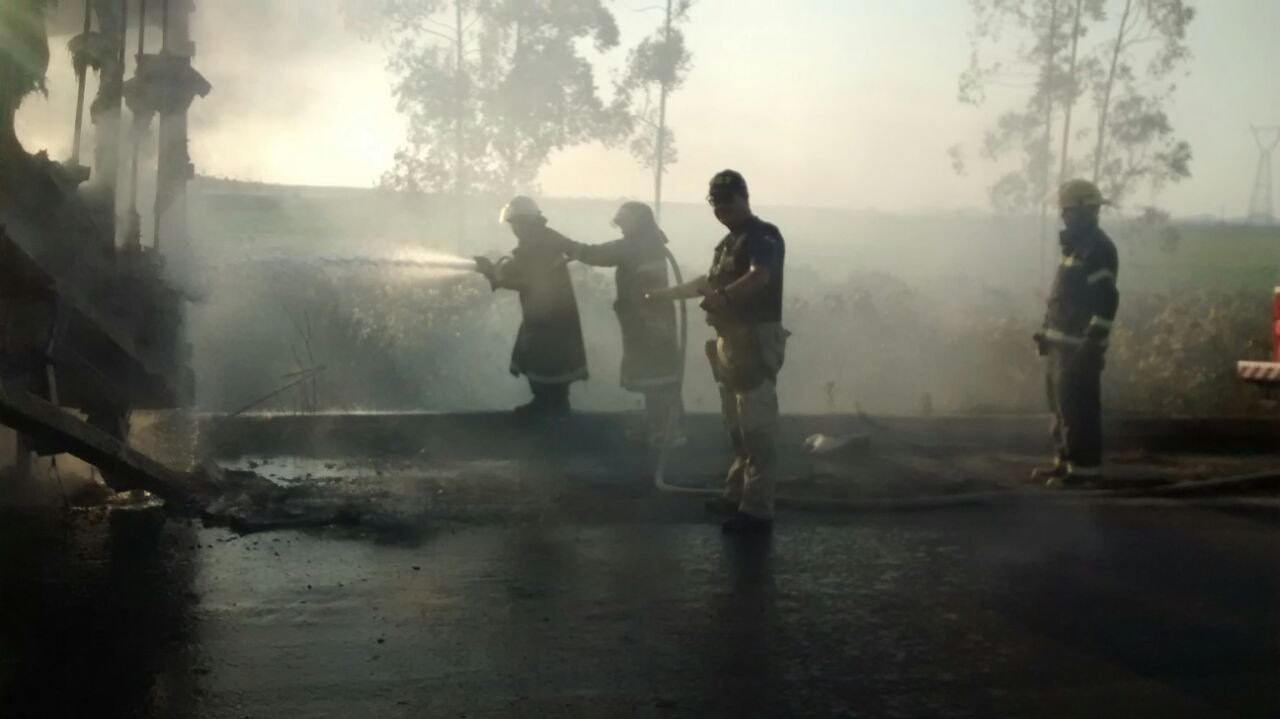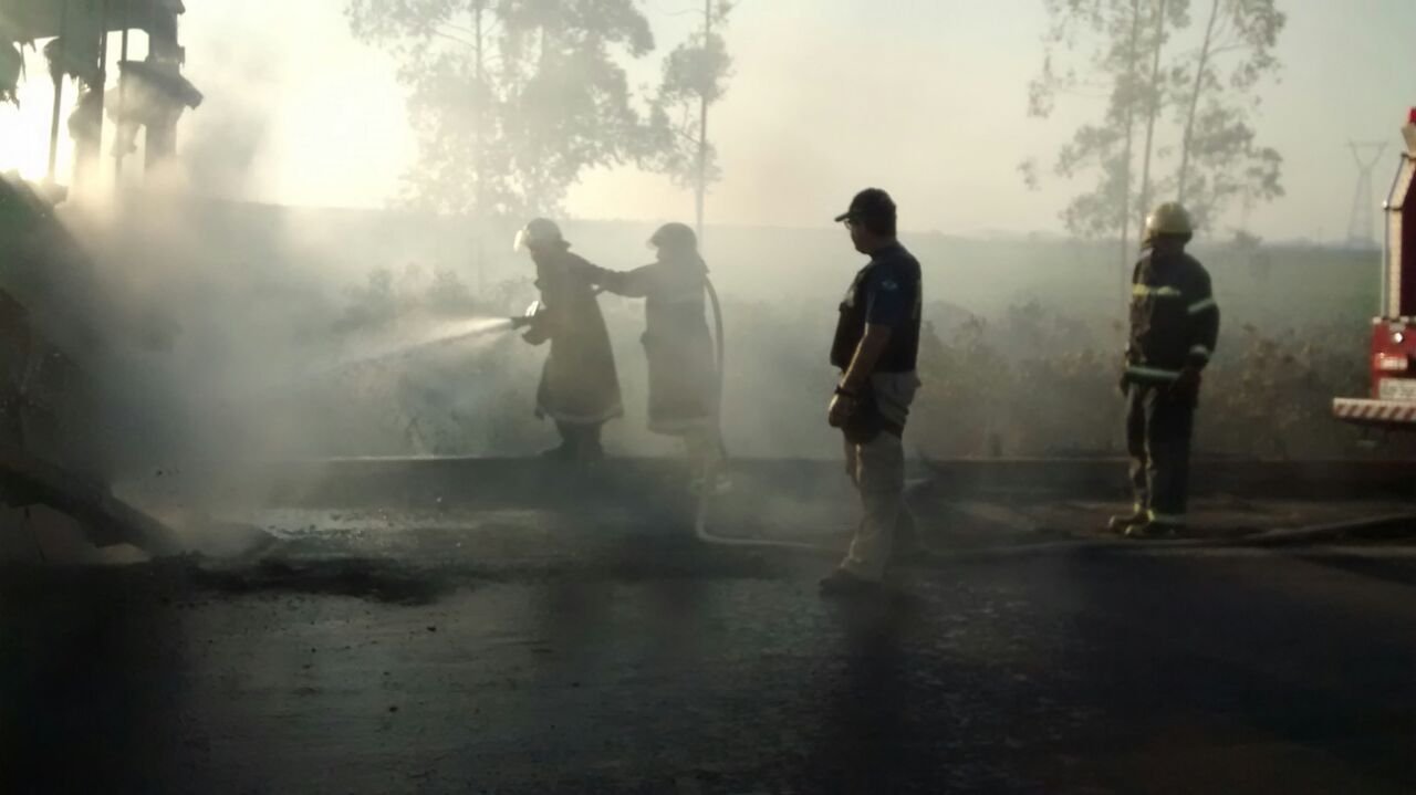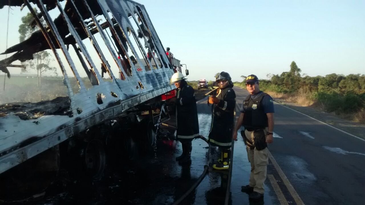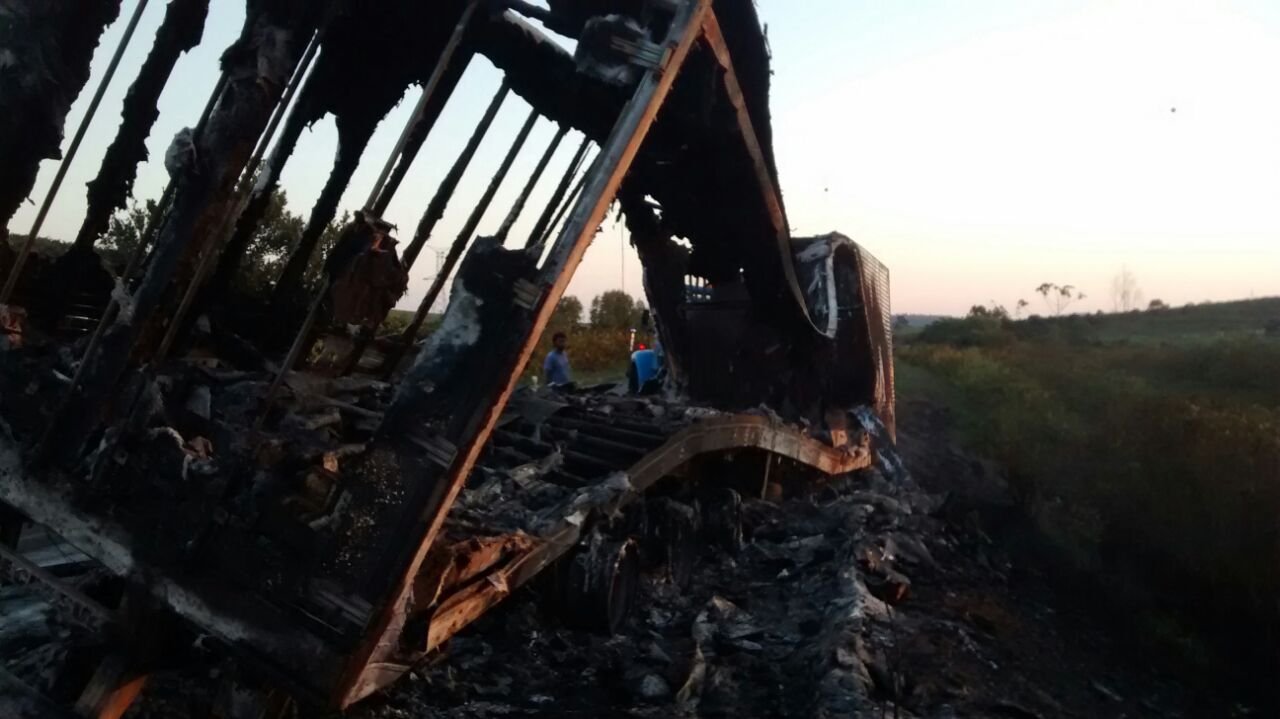 O incêndio ocorreu, devido ao tanque de combustível ter se soltado. O baú da carreta, ficou totalmente destruído. No momento do acidente, não havia carga no baú.